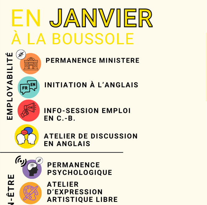 À La Boussole, nous proposons une offre complète de services en français pour vous accompagner au quotidien selon vos envies et vos besoins mais également une grande variété d’activités communautaires favorisant les échanges et l’apprentissage pour parler en français et rester en contact avec des francophones de tous horizons.