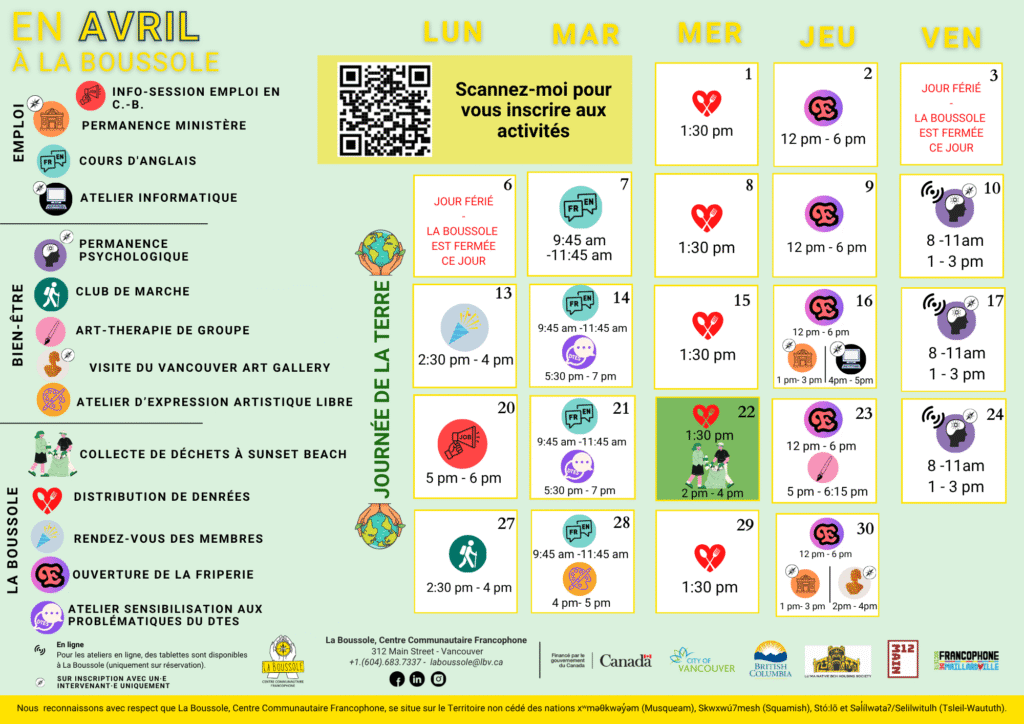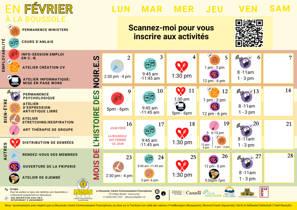 La Boussole, Centre Communautaire Francophone est un organisme francophone de bienfaisance qui œuvre depuis 34 années en Colombie-Britannique. Notre mission est de venir en aide aux francophones en situation de précarité dans notre province et de répondre aux besoins toujours en hausse de nos adhérents. Nous proposons à nos bénéficiaires une offre complète de services en français pour les accompagner au quotidien ainsi qu’un espace communautaire chaleureux et ouvert à toutes et tous. Notre ambition est de rassembler la communauté afin d’aider ceux qui en ont le plus besoin, tout en réduisant les stigmates qui pèsent sur eux.